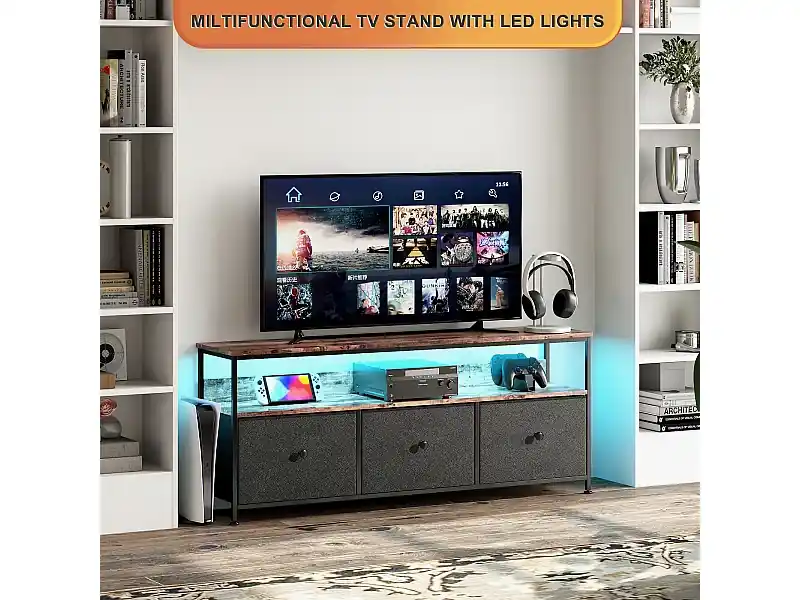 108 cm TV-Schrank, mit 3 Schubladen, Regalen, Metallrahmen, rechteckig, Vintage-Industriestil, Wohnzimmermöbel aus Holz – Schwarz Echt