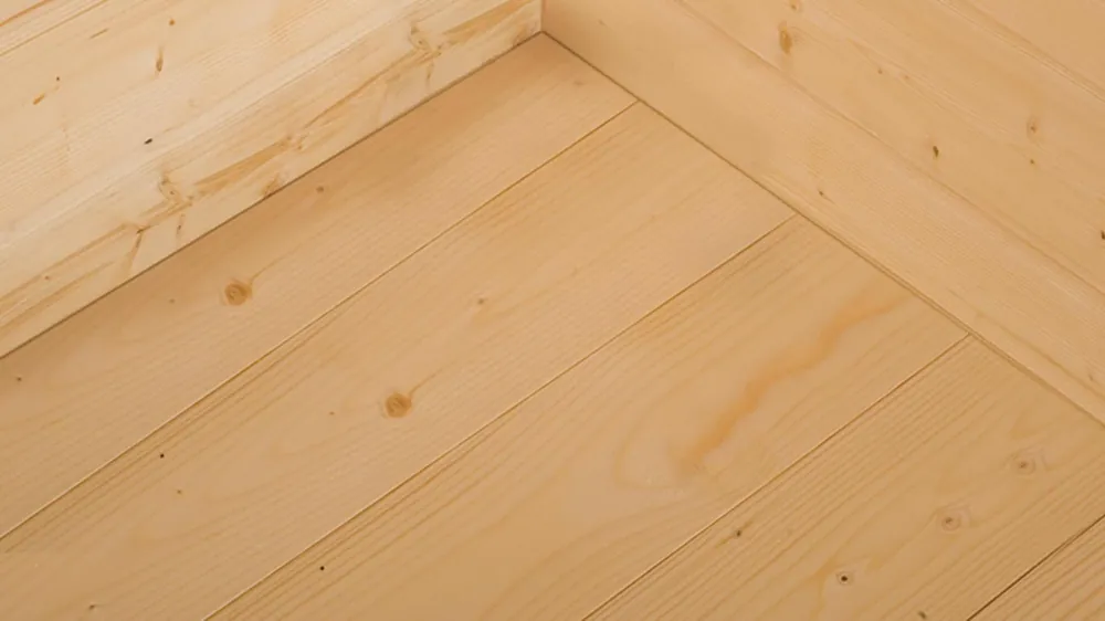 Erweitern Sie Ihr Gartenhaus 209 mit unserem 16 mm starken, naturbelassenen Massivholzboden aus europäischer Fichte.