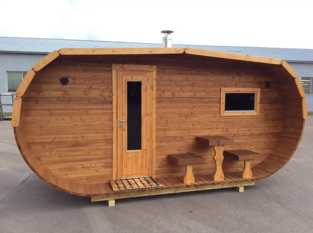 Durch das rustikale Erscheinungsbild wird die Sauna in Ihrem Garten zu einem deutlichen Blickfang. Die Ovale Form bietet eine komfortable Stehhöhe im Innenbreich und die kleine Sitzgruppe auf der Terrasse lädt nachdem Saunagang zum verweilen ein. Die Arctic Oval Sauna ist aus Thermoholz von hochwertigen nordischen Kiefern gefertigt.