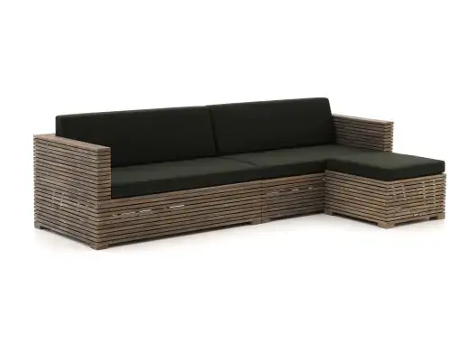 Das ROUGH C Chaiselongue Lounge-Set ist ein kompaktes 3-Personen Lounge-Set für alle, die sich gern ausstrecken, aber nicht die ganze Terrasse zustellen möchten. Der Teakholzrahmen in grau gewaschener Optik ist sauber verarbeitet, sodass alles stabil steht und Ihr Set ordentlich aussieht – auch bei täglicher Nutzung. Die gut gefüllten grünen Kissen bieten Halt, auch wenn Sie länger sitzen, sodass Sie entspannt ein Buch auslesen oder einen langen Sommerabend genießen. Dank der Liegefläche können Sie sich auch einfach mal hinlegen, ohne gleich eine Gartenliege aufzustellen. Und wenn die Bezüge schmutzig geworden sind, öffnen Sie den Reißverschluss, nehmen sie ab und geben sie in die Waschmaschine – schon bereit für die nächste Runde.