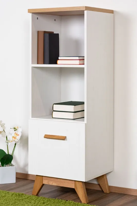 Mit dem Bücherregal Panduros 07 wird Ihr Wohnzimmer zu einem echten Hingucker. Dank der schlichten Optik und der modernen Farbkombination bringt es frischen Wind in Ihre Wohnlandschaft. Die länglichen Griffe sind in Eiche Braun gehalten und runden das Gesamtbild ab. Das Regal bietet mit einer Tür und 2 Ablagefächern genügend Stauraum für Ihre Bücher und Dekoartikel. Durch die einfache Montage des Bücherregales wird der Aufbau rasch gelingen.
