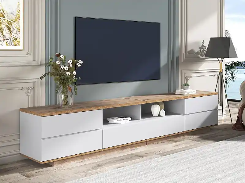 Zeitgenössischer skandinavischer TV-Schrank 180 cm aus Holz – 5 Türen + 8 Fächer – Natur und Weiß Nur Heute
